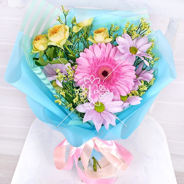 Гербера розовая- 1 шт., хризантема кустовая сиреневая -1 шт., роза желтая кустовая - 1 шт., лимониум желтый – 1 шт., упаковка, лента.