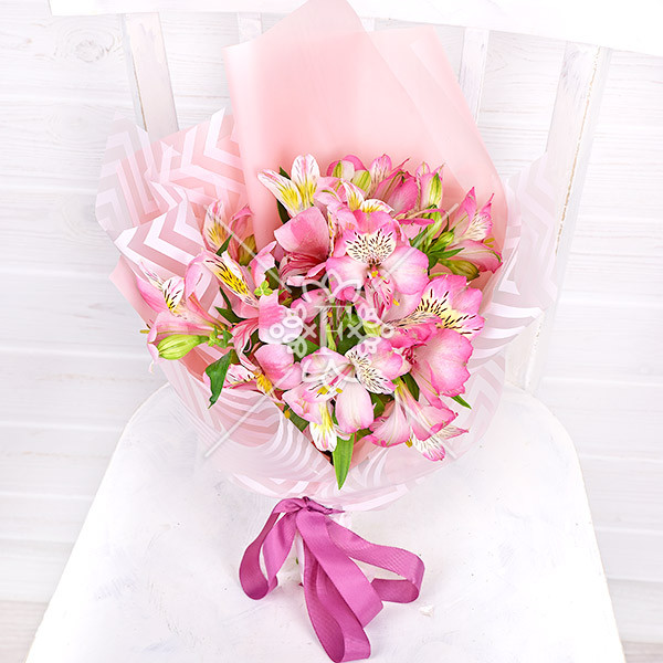 Альстромерия розовая – 3 шт.,упаковка, лента.