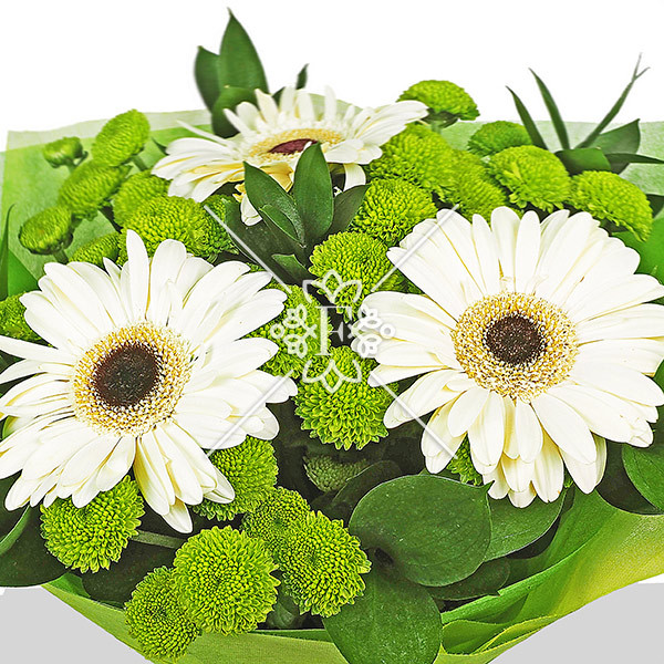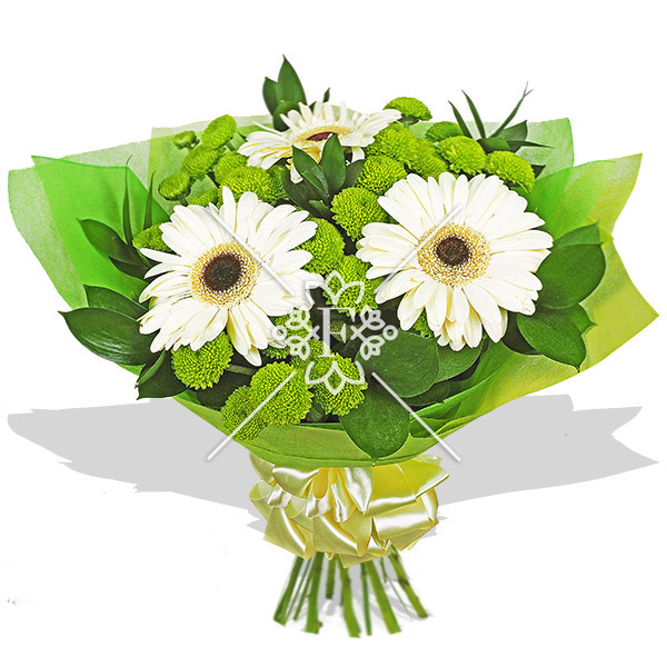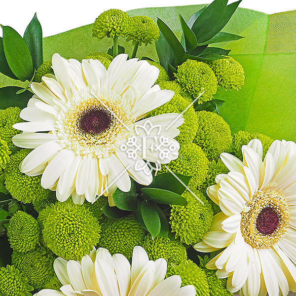 Букет из благородных белых гербер, в обрамлении аристократичных зеленых хризантем, создает неповторимо утонченную флористическую композицию.